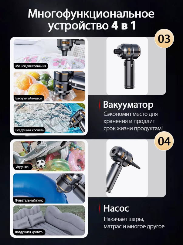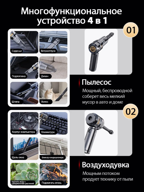 Цей універсальний портативний пилосос поєднує в собі функції прибирання, видування повітря, надування речей та очищення важкодоступних місць.